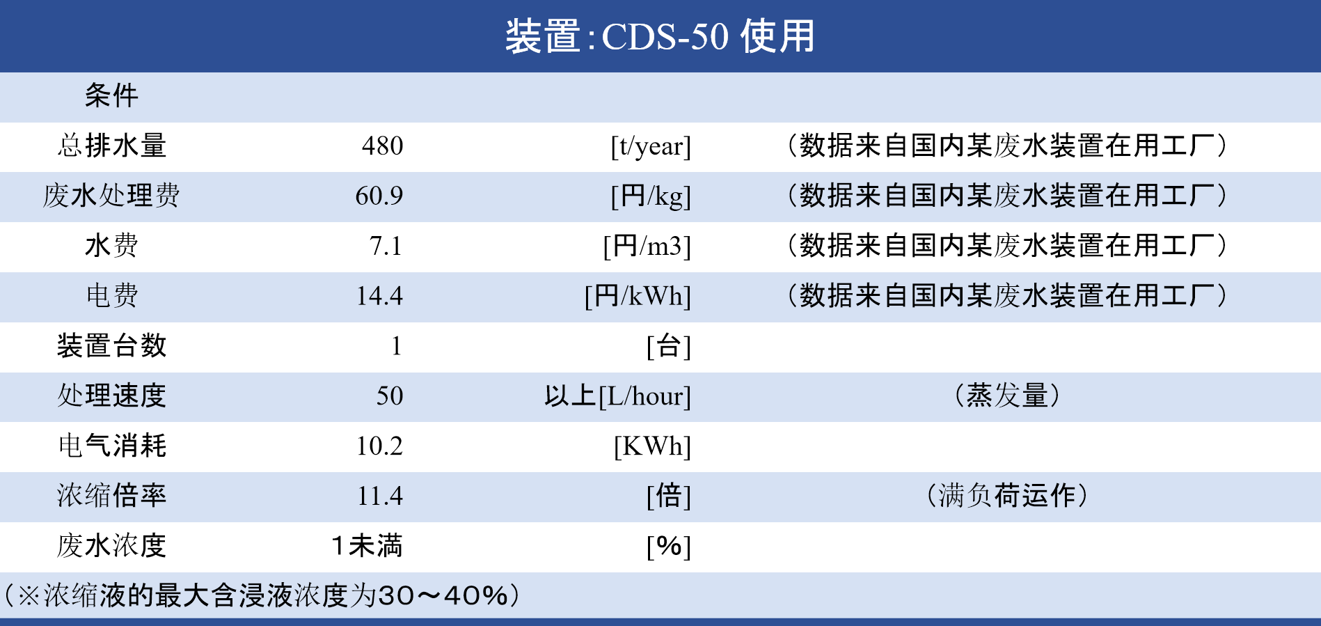(1) 成本測算的前置條件(以國內(nèi)某個正在使用Chuhatsu廢水處理裝置的工廠為例)